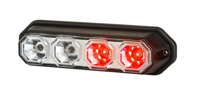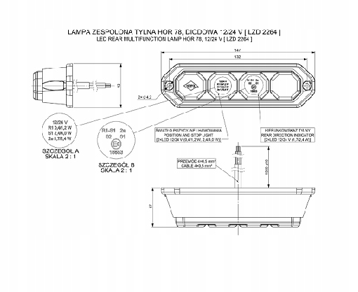 Trzyfunkcyjna lampa zespolona tylna: światło hamowania, pozycyjne i kierunkowskaz. Lampa wyposażona jest w 4 LED: 2 czerwone i 2 pomarańczowe.